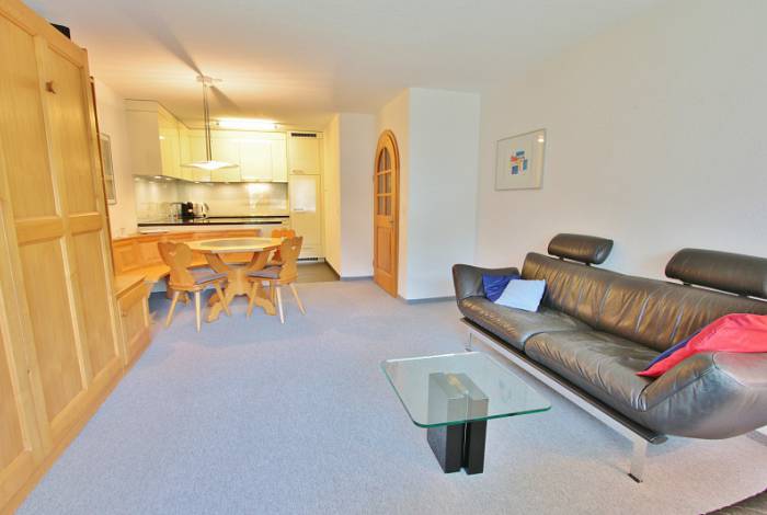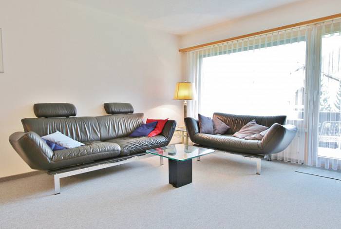 Schöne helle 2-Zimmer-Wohnung mit guter Aussicht in Mehrfamilienhaus mit Lift; Garagenplatz in der Einstellhalle; sonniger Balkon; Waschmaschine, Spielzimmer und Skiraum zur Mitbenützung.