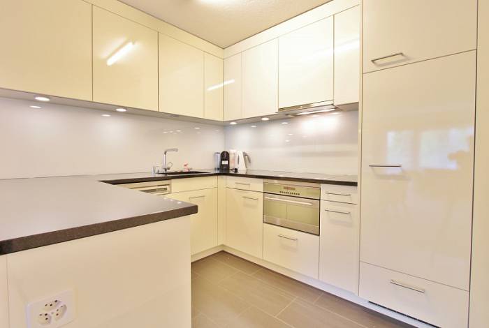 Küche mit Natursteinabdeckung, Glaskeramikkochherd, Backofen mit integrierter Mikrowelle, Kühlschrank und Geschirrspüler; Bad/WC mit Doppellavabo; separates WC; Schlafzimmer mit 2 Einzelbetten; Wohnzimmer mit 2 Klappbetten und TV/Radio; gemütliche Esseckbank.